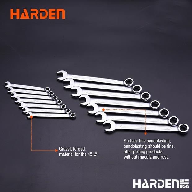 O Chaves Combinadas HARDEN é produzido em aço cromo-vanádio (CrV40) de alta resistência, com corpo forjado, temperado e revenido, garantindo durabilidade superior e torque seguro.