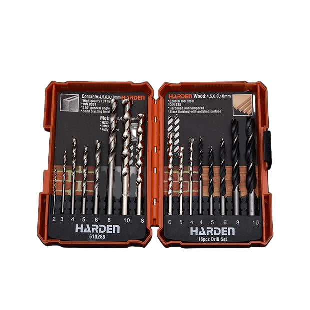 Jogo de Brocas HARDEN 16 Peças – HSS, Madeira e Concreto com Estojo Organizador